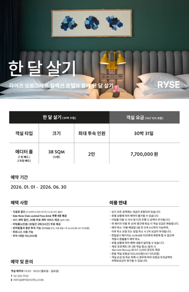 교통이 편리한 서울 시내에 위치함은 물론, 피트니스, 발렛 서비스, 반려동물 동반 투숙까지 깔끔하고 감각적인 환경에서 창의적인 영감을 불어 넣는 한 달, 라이즈에서 경험해보세요.